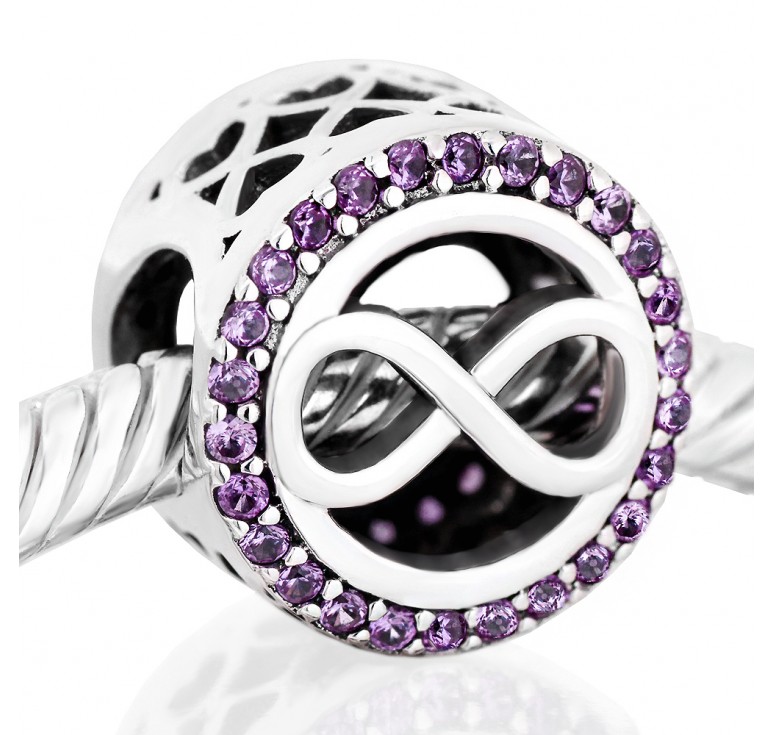 Abalorio Niagarra hecho de plata maciza 925 en forma redonda con piedras moradas y el infinito en el medio.